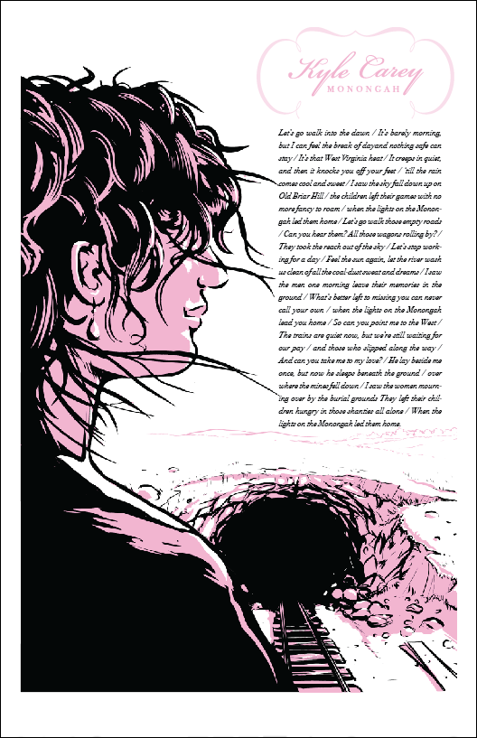 This one-of-a-kind-narrative poster of the lyrics of 'Monongah' was illustrated by graphic artist Ben Karis-Nix. A silk-screen printing on sturdy-stock paper, this poster is a lovely addition to your CD purchase.